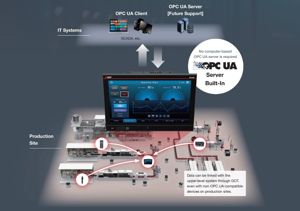 Image 2: With its integrated OPC UA server, the GOT3000 serves as a gateway and enables data integration between IT and OT systems.